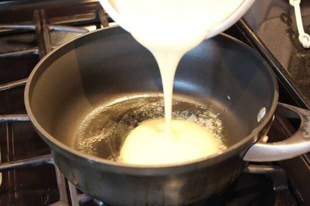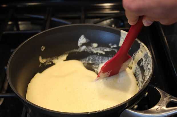 Vierta la mezcla de huevo mantequilla en la sartén caliente y dejar en la sartén y cocine durante 10 segundos.