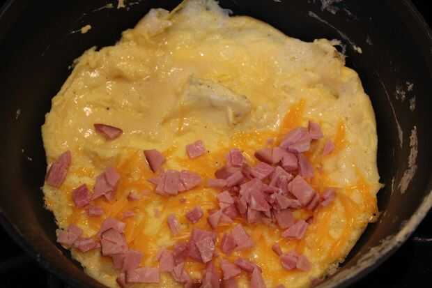 Espolvorea el jamón, el queso rallado y el pimiento opcional sobre una mitad del círculo de huevo.