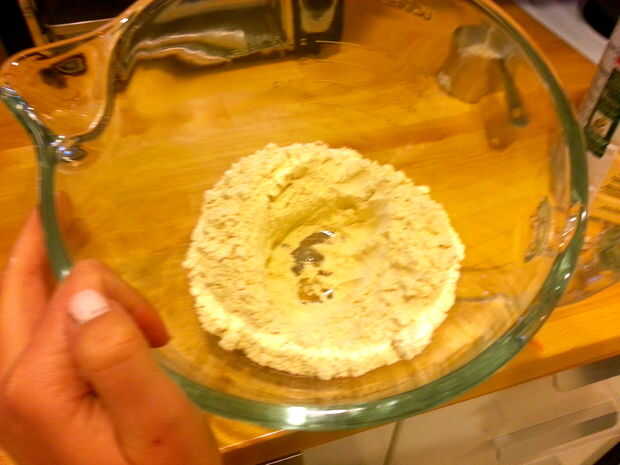 1. lugar de harina en el recipiente de tamaño mediano. Crear un pozo en el centro de la harina.