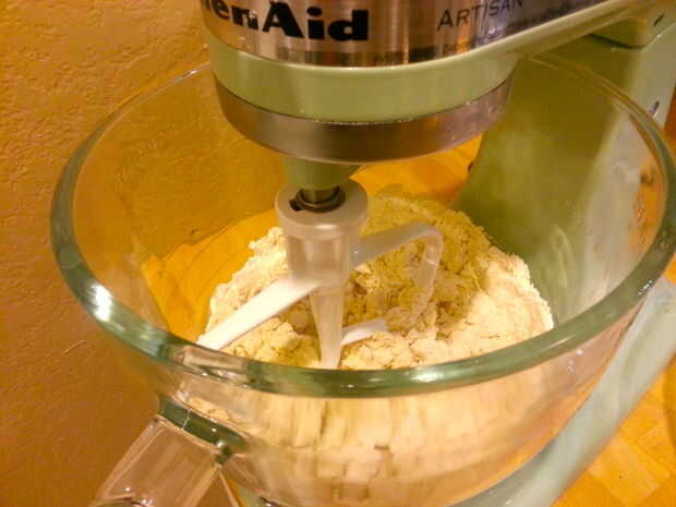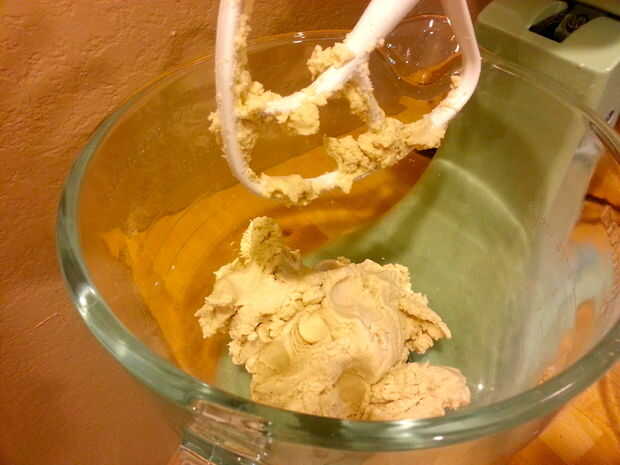 Añadir el agua inmediatamente en el centro del pozo. Mezclar a velocidad media, usando el accesorio de paleta hasta que se combinan la harina y agua y formas una bola de masa.