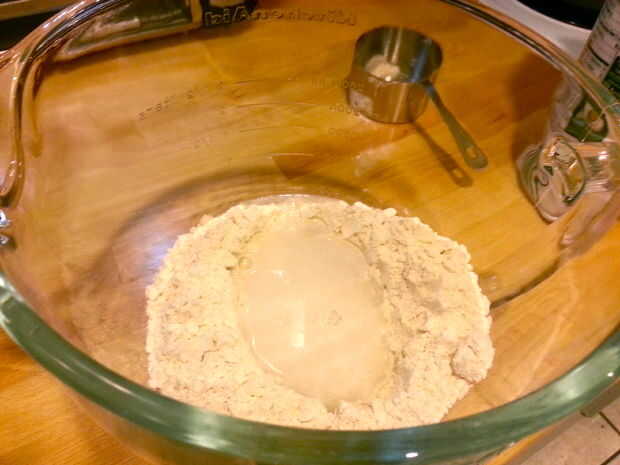 Añadir agua al centro del pozo. Con usted las manos o una cuchara de madera, combinar harina en el centro del pozo y mezclar hasta que toda el agua se absorba.