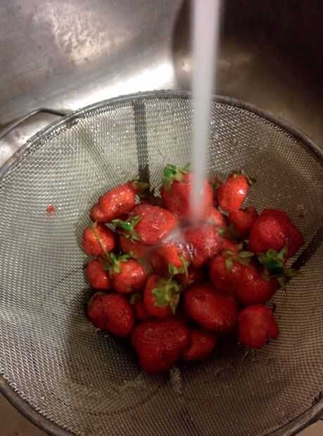 Recoger o comprar frutas. Lavar bien y cortar en trozos pequeños. Retire los tallos de fresas.