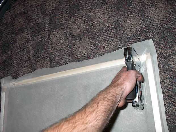 Estirar a este tejido apretado. Moje abajo primero. Cuando se seca parece más apretado. Empezar en medio de cada lado con una grapa y luego engrape cada cuatro esquinas. Seguir tirando firmemente y añadir grapas frente a la unos a otros de manera alterna. Recorte el exceso.