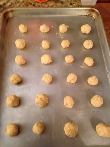 Después de que han mezclado todo bien. Amasen la pasta hasta que esté suave. Coloque sobre una superficie enharinada y cortar en cualquier parte. Sólo les ruedan en bolas pequeñas.
