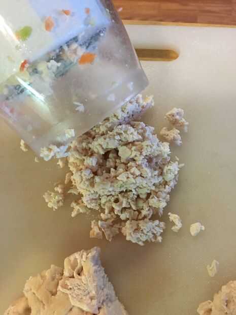 3. Coloque las dos pechugas de pollo picaditas en un tazón grande mezcla con vegetales picados