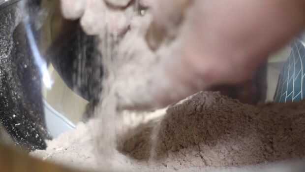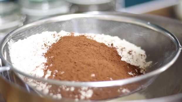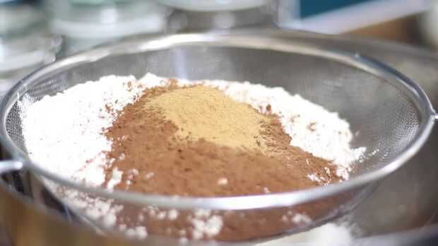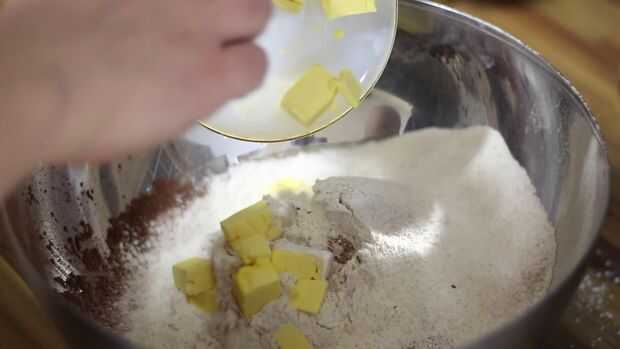 Pasar la harina, polvo de cacao y la canela en polvo (opcional) a través de un tamiz, incorporar los ingredientes secos y este agregar fría en cubos de mantequilla. Con la punta de los dedos desmenuzar la mantequilla y los ingredientes secos juntos hasta que la mezcla se asemeja a las migas de pan. Puede utilizar un procesador de alimentos pero con la mano es mucho más gratificante :)