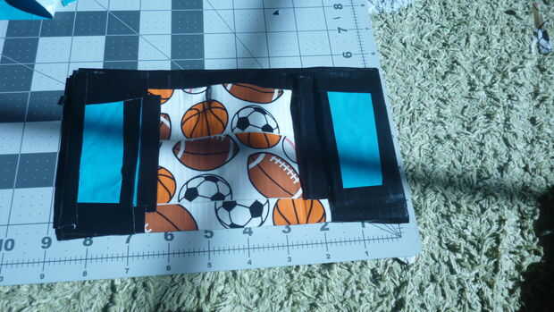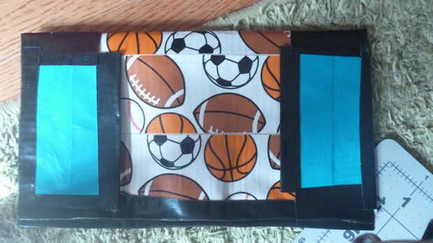 recordar que la mitad de la tira que guardaste? Bien cortado horizontalmente cada dos pulgadas. tomar una tira de 2 pulgadas y ponlo a un lado de las bolsas más grandes que usted acaba de hacer. lo mismo en el otro lado. luego gire hacia arriba en un ángulo de noventa grados y pegarlo en. hacer lo mismo con el otro, pero en el otro lado. ahora corte una tira de 9 pulgadas de cinta de tu segundo color, cortar por la mitad horizontalmente y cada una de esas tiras cortar por la mitad verticalmente. tomar uno y ponerlo en el lado de la billetera principal y doble sobre. lo mismo con el otro lado. ahora corte otra tira de cinta de 4 pulgadas de largo. cortar por la mitad verticalmente y luego corte cada lado por la mitad horizontalmente. tomar dos tiras y poner a cada lado de un pequeño bolsillo. cinta adhesiva sobre uno de los grandes bolsillos. lo mismo con el otro lado. Ahora toma las dos tiras la mitad y hacer lo mismo en los bolsillos de pequeños que usted hizo con los bolsillos grandes. recortar o doblar los bordes.