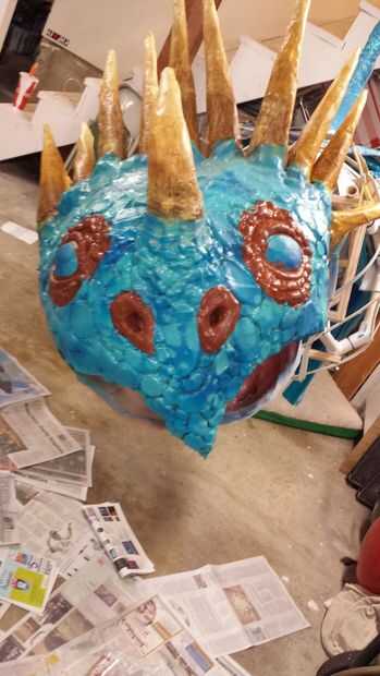La cabeza y los cuernos se hacen semejantemente al alas - pintura en aerosol, modge podge y plantillas.