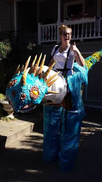 Me cubrió el cuerpo del pvc y las piernas con tela y utiliza las correas del morral para llevar la carga de la cabeza y el cuerpo. Tenía que poner pesas pequeñas en la historia para mantener en equilibrio. Que era la parte más difícil del traje, tratando de mantener todo equilibrada y reducir al mínimo el peso sobre mis hombros.
