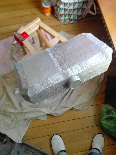 También añado un tapón de plástico de una caja de café para dar el aspecto de Mjolnir en cómics de Kirby. Y terminó rodeando el asa con una pequeña correa de cuero, este entramado con chinchetas y había añadido la dragonne.