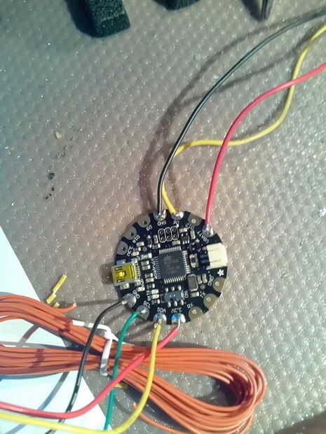 Flora es un poco Placa de Arduino es muy sencillo programar. Solo tengo que rama del LED (Neopixels), acelerómetro, probar las conexiones, escriba el programa (puedes descargar el código cerrado: accelerometre_base.ino). Y después de la prueba, la soldadura.