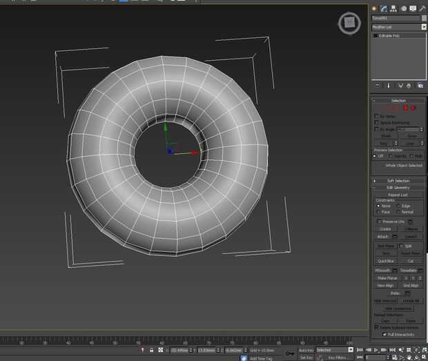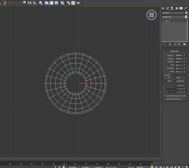 En la vista superior, sacar un toro haciendo clic y arrastrando. Usted notará que haga clic y arrastre una vez para el tamaño inicial, y luego haga clic y arrastre otra vez el espesor interior. Yo he marcado el radio de 1 a 3mm y el radio 2 a 1.5 milímetros. El objeto con el botón derecho y seleccionar convertir a: convertir a Editable Poly.