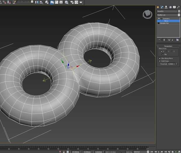 En la ficha modificación, agregue un modificador de simetría a Toro seleccionándolo en la lista de modificadores. Junto a la simetría, haga clic en el símbolo y seleccione el espejo. Pulse la tecla W para activar la herramienta mover, seleccione el gizmo de X con las flechas y mover a sobre como en mi ejemplo o seguir su diseño.