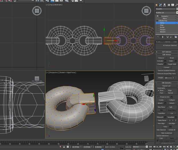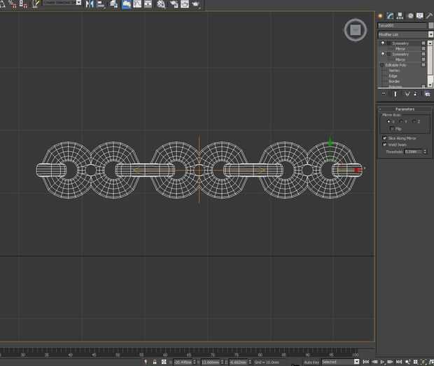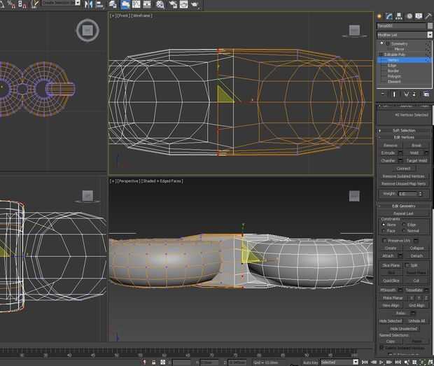 En la vista superior, seleccione el objeto. En la lista de modificadores, seleccione simetría. En simetría, haga clic en el símbolo para abrir +. Seleccione el espejo. Presione la tecla W para mover la línea de simetría hacia la izquierda (ver ejemplo). Si la geometría de la Unión es un poco más corta que le gustaría (o más) puede editar los vértices en Editable Poly.