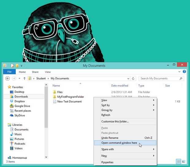 5. cambio de tenencia haga clic derecho sobre "MyFirstProgramFolder" y seleccione "Abrir ventana de comandos aquí...". Como en la imagen.