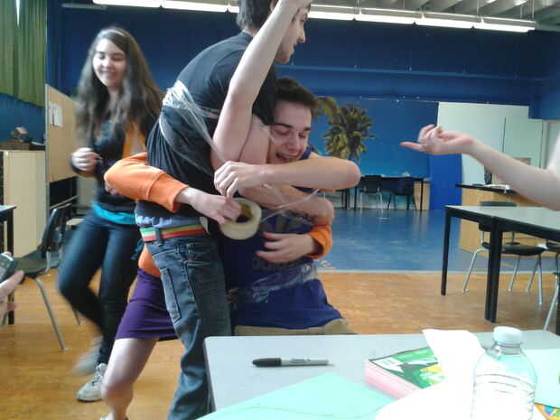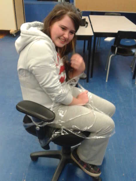 Así que único lo que hacemos normalmente en clase de animación es tonto alrededor con cinta. Sé que esto puede sonar muy estúpido o como un niño pero su diversión y mantiene todo el mundo riendo y sonriendo. Así que tome la cinta y enróllelo alrededor de dos personas. Incluso puedes grabar una persona a una silla o una pared. Nos gusta usar cinta porque es sólo diversión para ver a alguien intentar y salir de la cinta. Es mejor intentar esto cuando un maestro de suministro está cubriendo su clase. Generalmente no están preocupados por el presupuesto de la cinta.