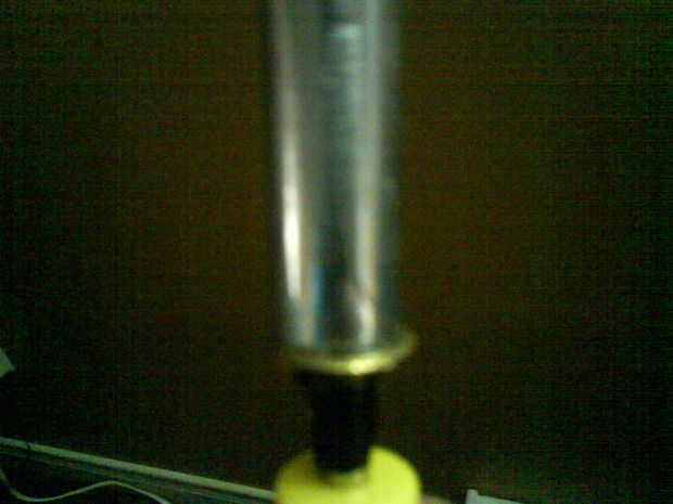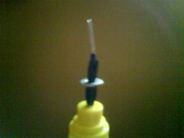 Ahora agregue una capa de pegamento caliente en la parte superior de la lavadora, todos alrededor de él y añadirle el tupe de metal para que esté colocada en su posición. Cuando todo se seca el tubo metálico debe ser un poco más alto entonces el tubo de plástico, esto hace que el tubo de tinta plástica no derretir y la llama no baja baja entonces el tubo metálico.
