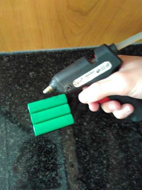 Asegúrese de que las baterías se alinean arriba y cerca uno del otro y luego aplican pegamento caliente a ambos lados de la batería.