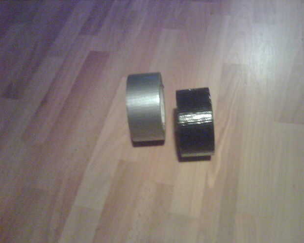 Si ha utilizado mi método, ahora es el momento para sellar hacia atrás la aleta de la bola. Encolar la tapa con pegamento del gorila, pero la cola era probablemente innecesaria debido a la posiblemente excesiva cantidad de cinta que cubrí la bola con la siguiente. Grabado tres capas del conducto cinta, gris-negro-gris, con la diferencia de color a si mi patrón de grabación en efecto había cubierto la bola totalmente.