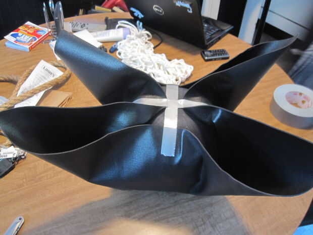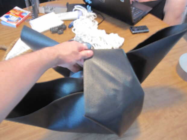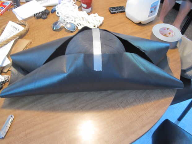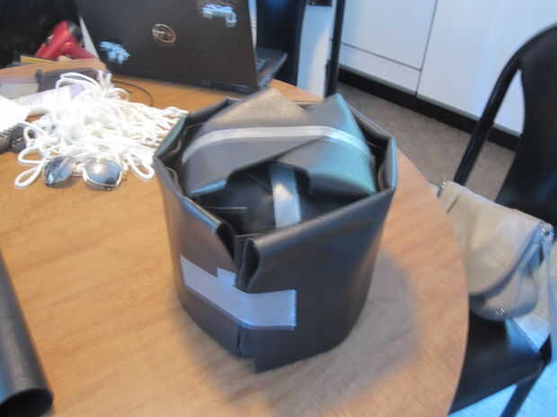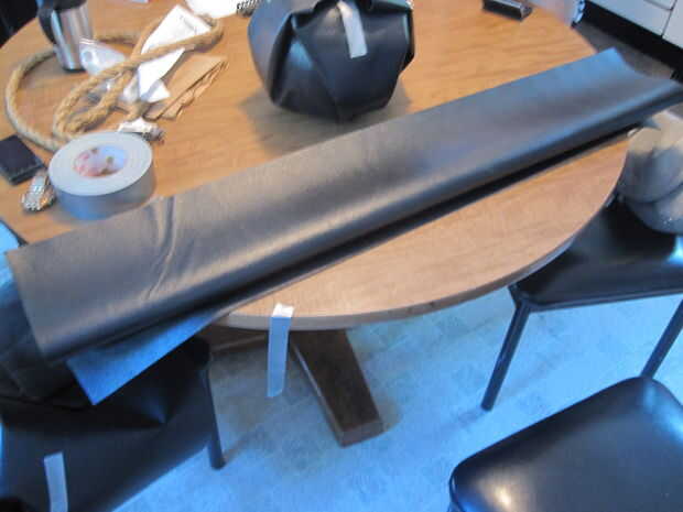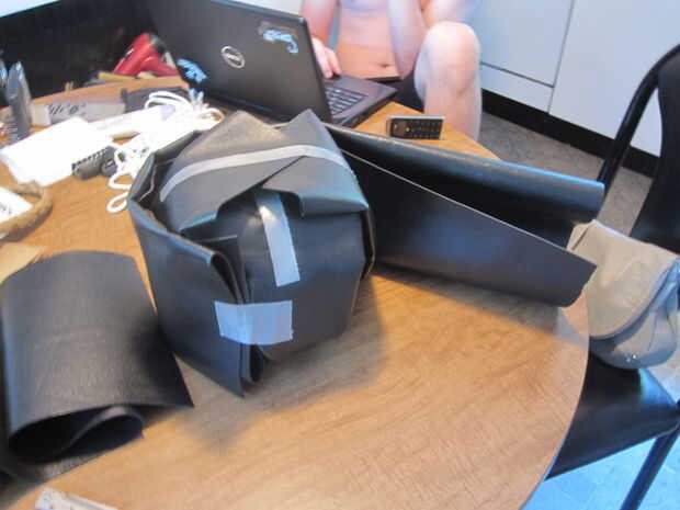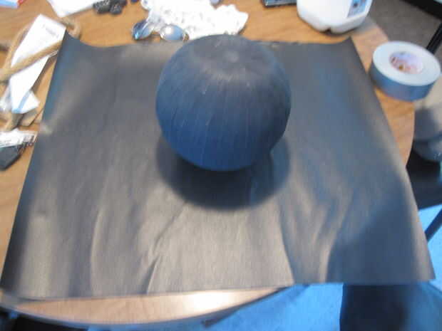 Este es el comienzo de envolver la bola de medicina original de mi otro instructivo con una estera de yoga, para que sea un poco más suave tras el impacto con el cemento.