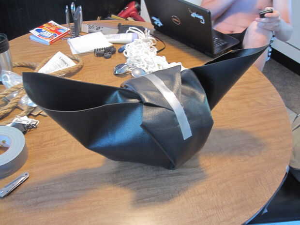 Comentar un cuadrado de estera de yoga, conseguí mi cuchillo y mi cinta práctico y fue a trabajar.