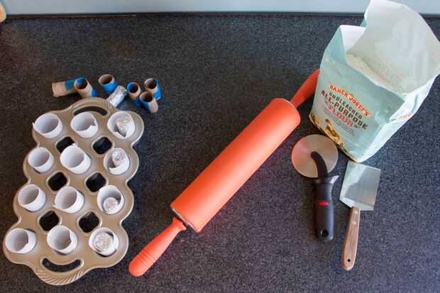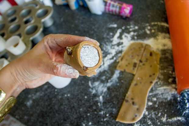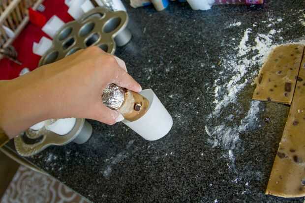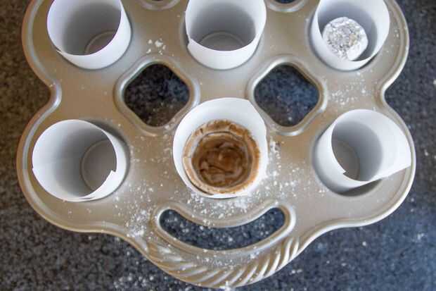Mi primer intento fue envolver la masa en el vaso original, pero me pareció más eficaz utilizar la pieza central que eventualmente iría durante el proceso de cocción. Y es mucho más fácil conseguir el pergamino antes de volver a poner en la sartén.