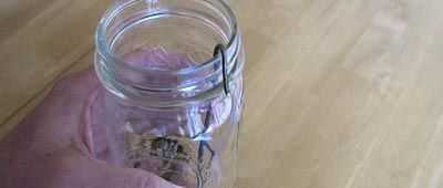Forma un gancho de cuelgue sobre el borde del tarro, como se muestra. Asegúrese de que el anzuelo se coloca tales que la bobina de mecha se encuentra en la parte inferior de la jarra.