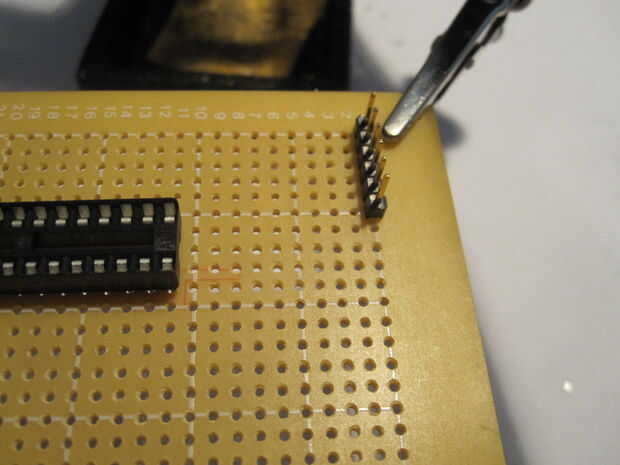 En el extremo opuesto del tablero de la toma de corriente, la soldadura de la fila de encabezados masculinos 6. Conecte el primer pasador a pin uno en el chip mediante un capacitor de 0.1 uf, el segundo a pin 3, la tercera al pin 2, el cuarto a 5 volts, la quinta no conectarse y conectarse a la sexta planta.