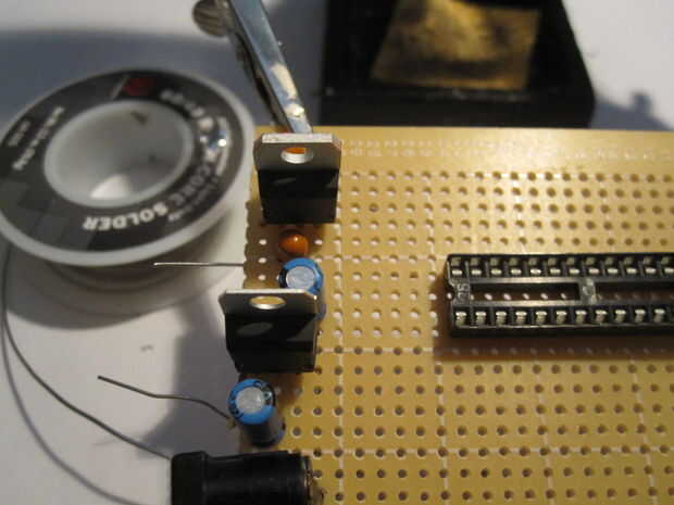 Es muy importante recordar que 3.3v regulador no tiene el mismo pinout como el 7805. Con el lado impreso hacia usted y los pernos de abajo el más lejano a la izquierda es el centro es la salida y el derecho más alejado es la entrada. Otra vez necesita dos capacitores de desacople. Conecte uno de los 10 chapas de tantalio de uf entre salida y tierra y el otro entre la entrada y prestando atención a la polaridad de la tierra. el positivo debe etiquetarse en el frente de la tapa, el otro es negativo y su negativa conduce en estas tapas Haz conectado al pin de más lejos izquierdo en el regulador.