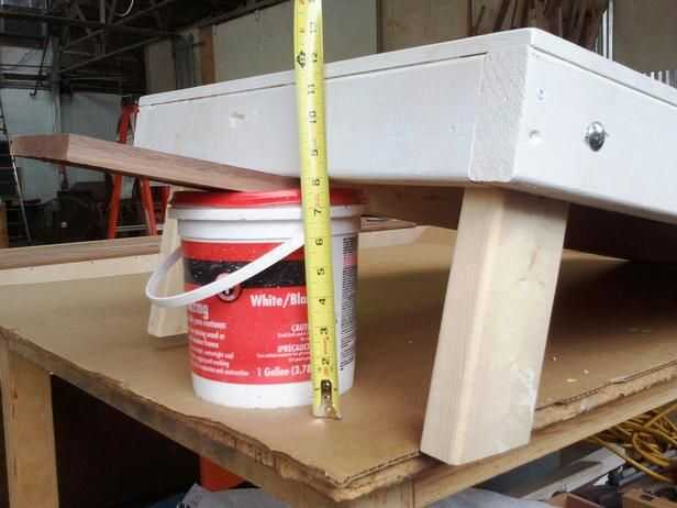 2.) encontrar un objeto que será lo suficientemente alto para sostener el borde de la plataforma 12" pulgadas sobre el tablero de la mesa y lo suficientemente estable como para soportar el peso durante la medición