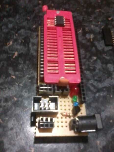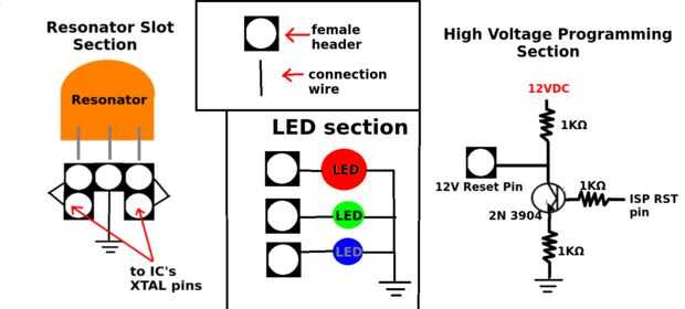 Lo básico es que cerca de cada componente hay algunas mujeres rompiendo. La ZIF todo es explotado, el conectador de la ISP es explotado a 2 encabezados por señal. También hay un resonador (sistema de cristal-condensador) ranura con 2 explotado pernos que van directamente a los pines XTAL de IC (para usar el oscilador externo). Los LEDs se utilizan para el ISP de Arduino sketch, que define las señales de LED 3: el latido del corazón (un LED intermitente que muestra que el arduino no se estrelló) - para que utilizo el verde del LED, la programación (este se enciende cuando hay comunicación con el IC) - para que uso el azul uno y el Error (se enciende cuando se produce un error) - para que utilizo la más grande Red uno.