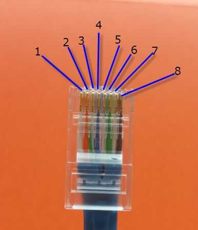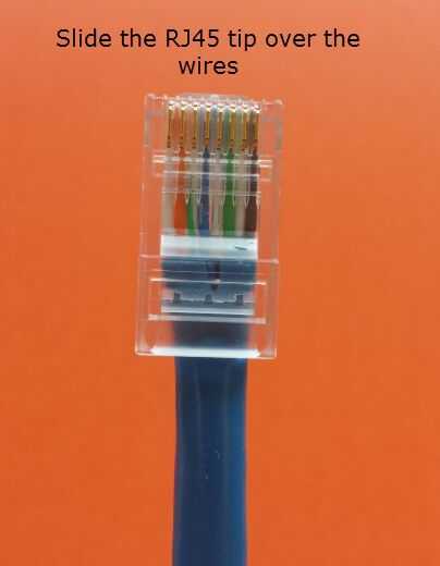 Diapositiva el RJ45 conector sobre los cables asegúrese de que parte de la chaqueta azul es bien dentro de la cabeza de RJ45. Al deslizar el conector RJ45, asegúrese de que pin número uno está a su izquierda (ver imagen de la posición del pin 1).