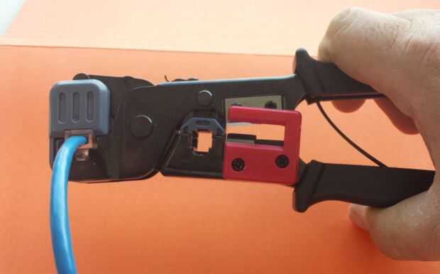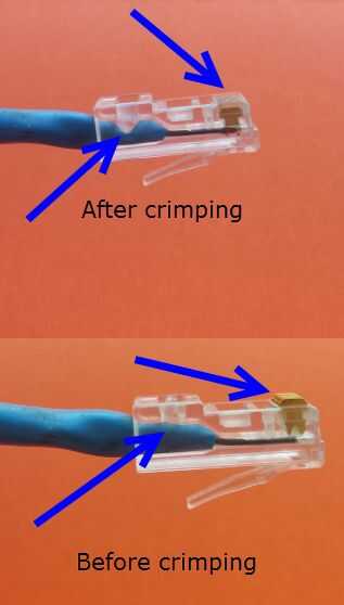 Poner el conector RJ45 en el prensado y prensa dura, que la forma cambiará un poco, la chaqueta azul será atrapada en el RJ-45 y los conectores de cobre sobresalga de los RJ45.