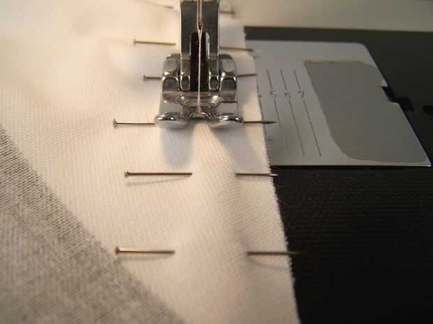 Paneles de la puntada. Con las manos, mantener una cantidad incluso de presión sobre tela detrás de pie prensatela y la tela lista para ser cosida a las costuras coser plana y lisa.