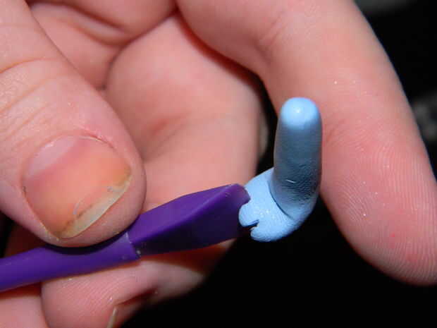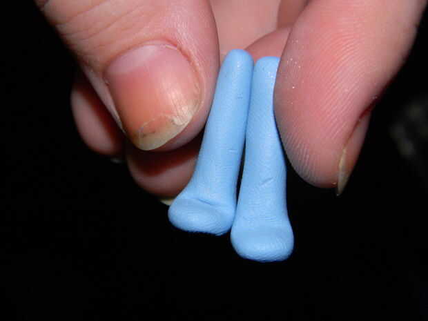 Tome dos de las bolas y separarlos en registros. (Si desea más gruesas patas traseras puede tomar aproximadamente una quinta parte de los registros de brazo y agregar a los registros de la pierna). Tomar el brazo registra y pellizcar y flatted aproximadamente la cuarta parte del brazo, se trata de pies de tu gatito. Luego doble el pie encima para que es 90 grados el resto de la pierna. Un palillo de dientes o una herramienta de escultura, y pulsar en dos líneas en el pie para crear los dedos del pie.