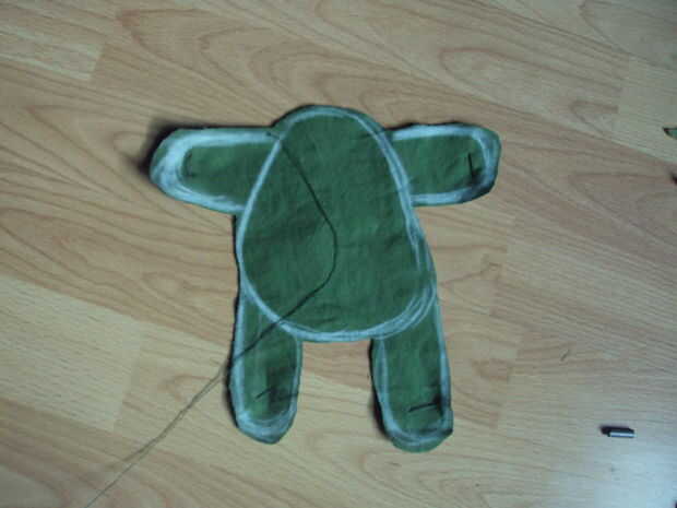 A continuación, dibuje un contorno del cuerpo. Como con los tentáculos de la cabeza, uso de pernos de seguridad para cada miembro para que ambos lados de la tela de permanecer en el lugar. Recorta el contorno del cuerpo y empezar a coser en el brazo y en todo el cuerpo, dejando una pulgada dos abertura en la parte superior.
