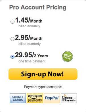 Pro cuenta precios. Esto demuestra los diferentes precios por mes y los tipos de pago que se aceptan. Usted puede elegir de 1,45 $/ mes, facturado anualmente, $2,95 al mes, trimestral, de pico o el mejor valor de $ 29,95/2 años, una vez que pago. ¿No estoy seguro que el problema es con una cuenta Pro? No temas, porque en la parte inferior de la página el sitio enumera todas las ventajas de la cuenta Pro en comparación con una versión gratis. Ahora, después de hacer una decisión difícil, llegará a una pantalla para su correo electrónico, nombre de usuario, contraseña, edad (puede ser oculta), el sexo y código postal.