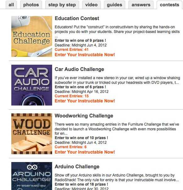 concurso . Aquí tienen varios concursos para los diferentes tipos de proyectos, de juegos de azar a la escuela de enseñanza, con muchos premios posibles. Por ahora usted debe tener una idea de su propio instructivo, pero si no, sólo mantienen la búsqueda. Estoy seguro que encontrarás uno.