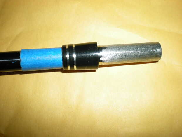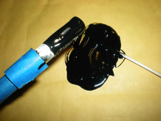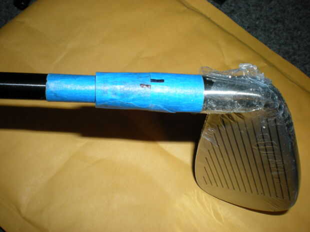 Usando un palillo o mondadientes agitación, dab cuidadosamente la mezcla de epoxi sobre la punta de eje. No tiene que ser perfecto y no utiliza demasiado, sólo se exuda en el hosel al instalar el eje. Es increíble qué tan fuerte es la materia. Alinee las marcas, limpiar el exceso de epoxy y el club en una caja de cartón. Repita para todos los clubes y que curar durante la noche.