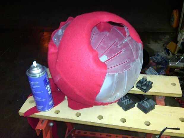 Lijar ligeramente la cabeza para que el pegamento se puede pegar a la superficie. Use sus tijeras de tela para cortar tiras grandes de fieltro que cubre gran parte de la cabeza sin arrugarse. Rocíe algún pegamento pegajoso un estiramiento de la tela agradable y apretado. Corte el fieltro sobrante, dejando una pulgada de fieltro extra. Hacer cortes en el exceso de fieltro. empezar a plegar y pegar el fieltro dentro de su cabeza. Hacer ranuras en los lados para los oídos para adaptarse.