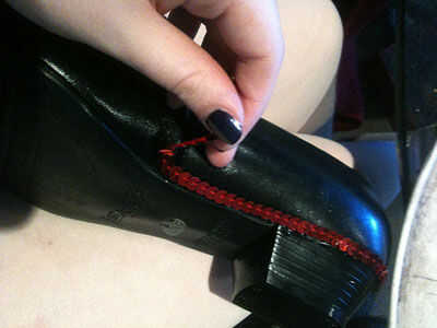 Paso 3 – continuar pegando y presionando lentejuelas en pequeños segmentos, todo el zapato, hasta llegar a la parte de atrás de la costura otra vez.