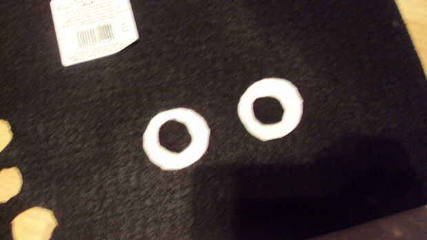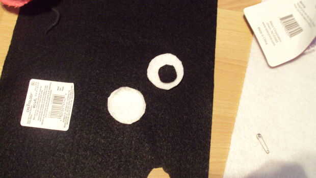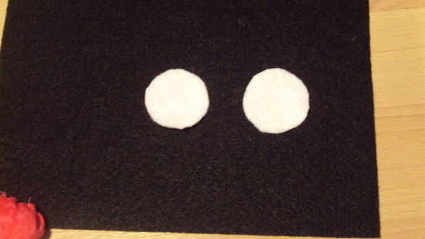 Con fieltro blanco y un lápiz, dibuja un círculo para el ojo y cortar con las tijeras. Colocar el corte en el círculo sobre otro pedazo de fieltro blanco y asegúrelo con un pasador de seguridad, corte alrededor del círculo para hacer otro ojo.