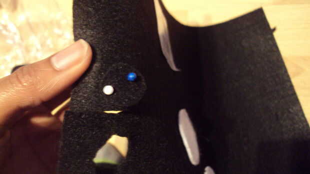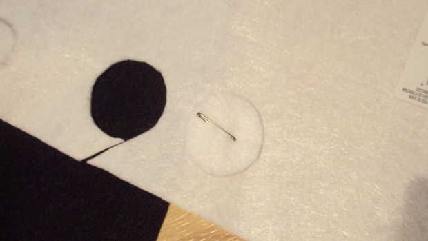 Con fieltro negro y un pedazo de carbón blanco, dibujar un círculo más pequeño de la pupila y corte. Realizar los mismos pasos para los alumnos como los ojos, pero use los alfileres de coser para asegurar el círculo más pequeño en lugar de otro para cortar alrededor de.