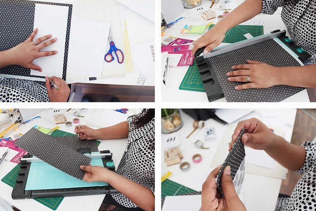 Colocar la plantilla sobre las Hojas de Papel 12 x 12 procediendo a marcar y cortar al largo de 12". Una Hojas de Papel 12 × 12rinde para 2 divisores.