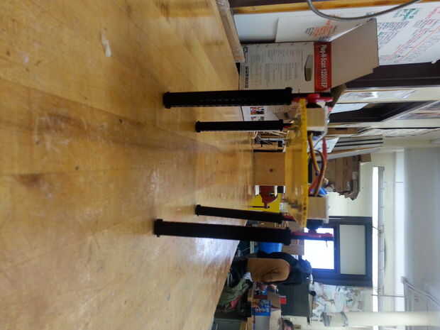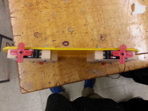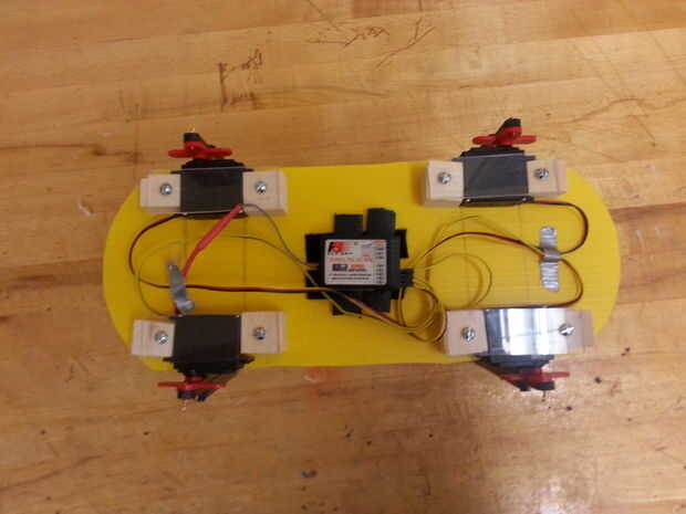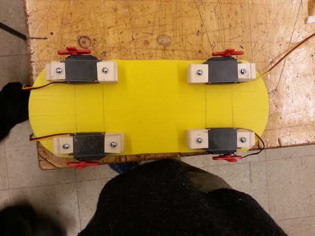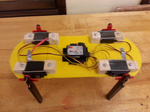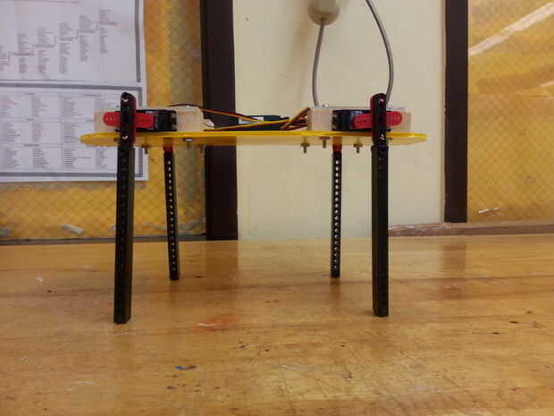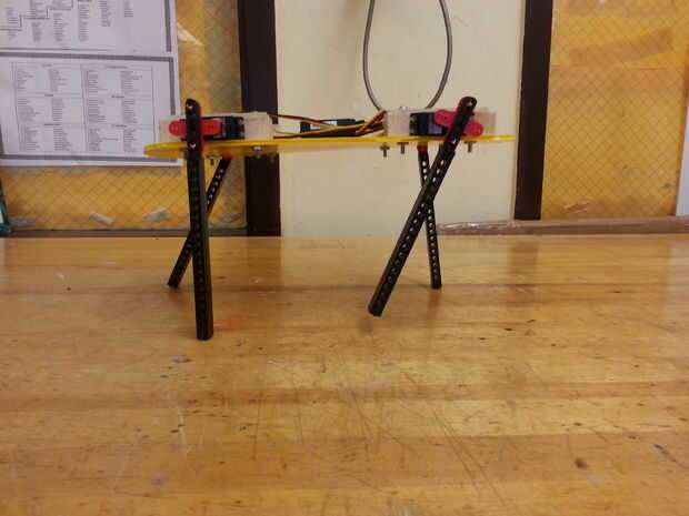 Al principio, las piernas estaban destinadas a ser madera de balsa o acrílico pero palillos de plástico eran más fáciles de administrar---pueden ser Unidas por pernos y fácilmente cortadas o modificadas. Primer conjunto de piernas eran de solamente un palo pero para aumentar la resistencia y estabilidad, se utilizaron tres palos cortos para las piernas. El palillo en el centro era un poco más por lo que se puede conectar a la parte superior del servo por solo alambre de cobre trenzado. El cable fue alimentado por la parte superior del servo y anudado, el filo fue cortado, doblado, y con cinta pato tan la piel no atascarse.