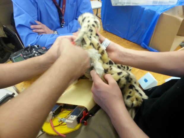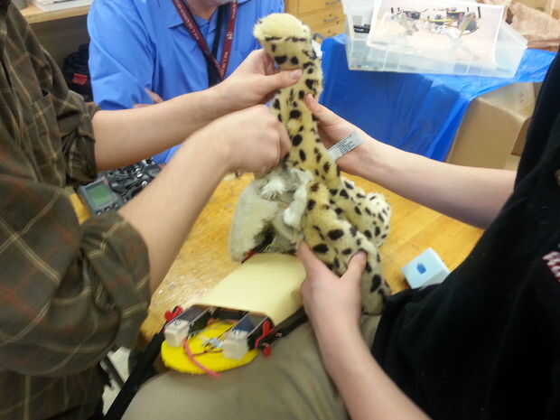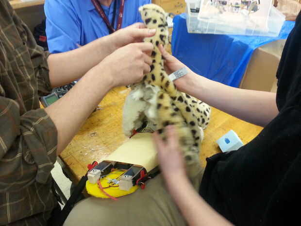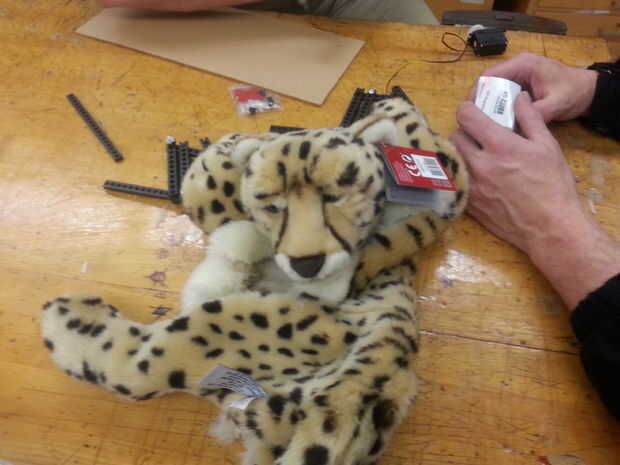 de todos modos, después, el prototipo fue instalado en la piel. Las agarraderas de espuma de poliestireno tuvieron que ser quitado para que se ajuste dentro de la piel. Las patas tenían pequeños Puffs en ellos para mantener estable y darle una pata plana. Sin embargo, una pinza cilíndrica de espuma de poliestireno fue utilizada más adelante para que las piernas se mantendría constante y conectado con las patas.