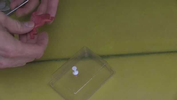 Las chinchetas se usaron para asegurar la rana de goma para el envase de plástico. Colocar el pasador por la parte inferior del recipiente plástico y luego por la rana de goma.