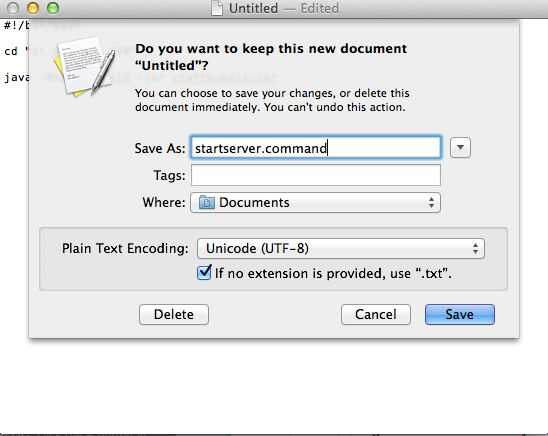 Guarde el archivo como startserver.command y ponerlo en la carpeta que hicimos al principio. Abrir Terminal que puede encontrar en el centro de atención o launchpad y pegar en chmod + x, entonces arrastre el startserver.command en la ventana. Debe mostrar el nombre del archivo después de poner en. Pulsar intro. Por último, abrimos el startserver.command y todas esas cosas se cargan.