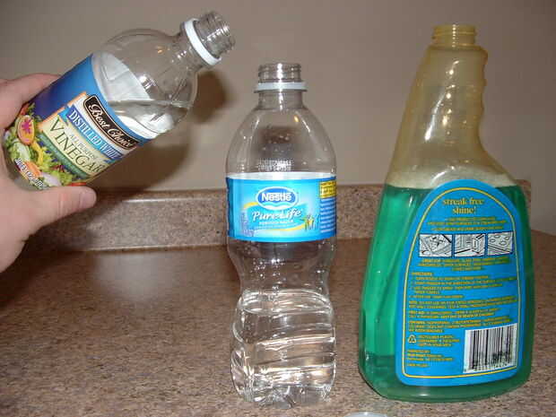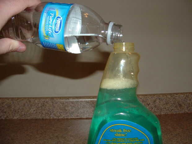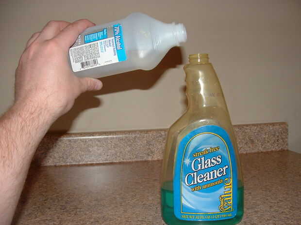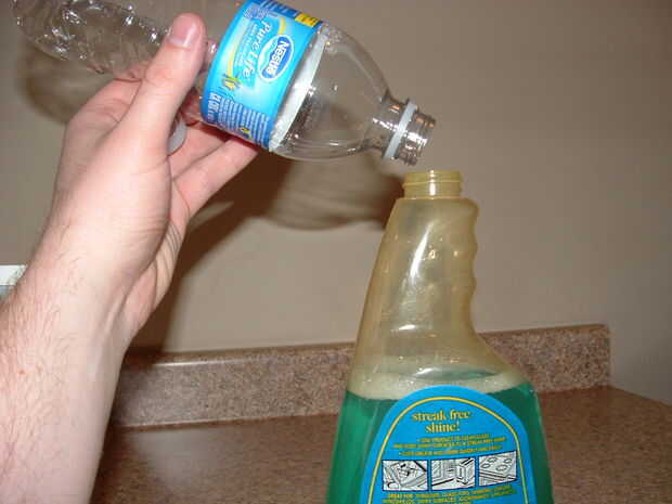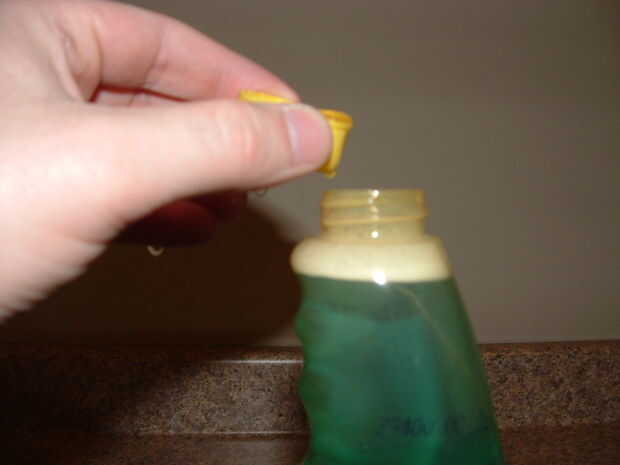 Después de aproximadamente la mitad del agua, añadir la media taza de alcohol, luego la media taza de vinagre para frotar. Luego agregar la otra mitad del agua y acabar mediante la adición de un lidful de jugo de limón. A diferencia de mis fotos, debe dejar una pequeña área de la parte superior no llenada. Niego con la mina para asegurar una buena mezcla. Si usted decide usar cualquier colorante, ahora es el momento para agregar unas pocas gotas rápidos. No utilizar cualquiera, y se puede saber que la mezcla acabada parece más verde que azul.
