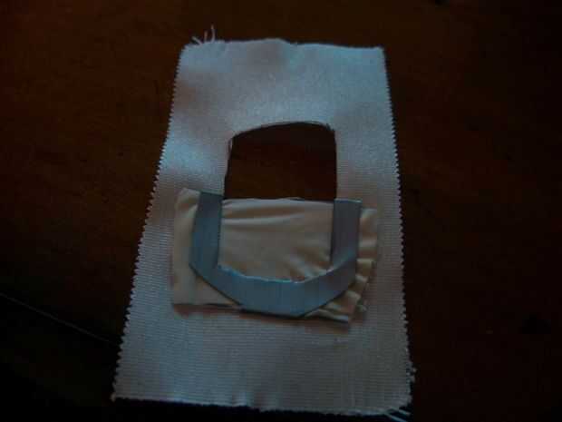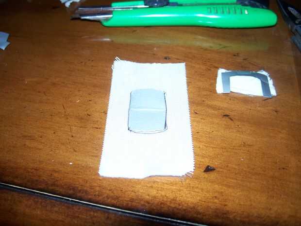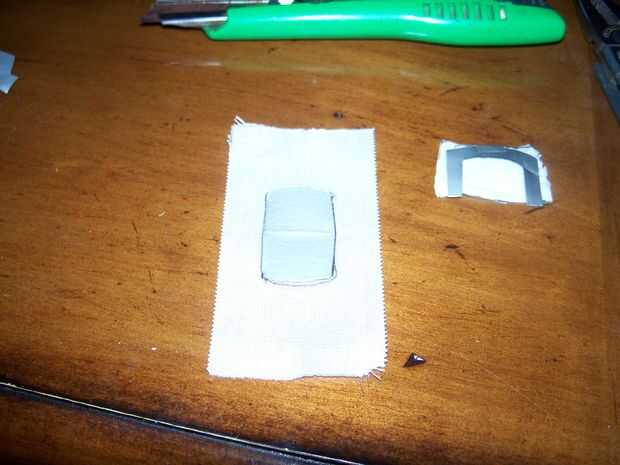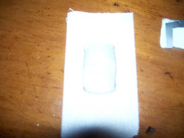 Luego tomar la pieza de cortar en el interior del marco y poner en el centro de la cinta. Trace una línea alrededor del corte con su navaja para cortar un agujero en la pieza de la cinta el tamaño exacto de la abertura en su marco.